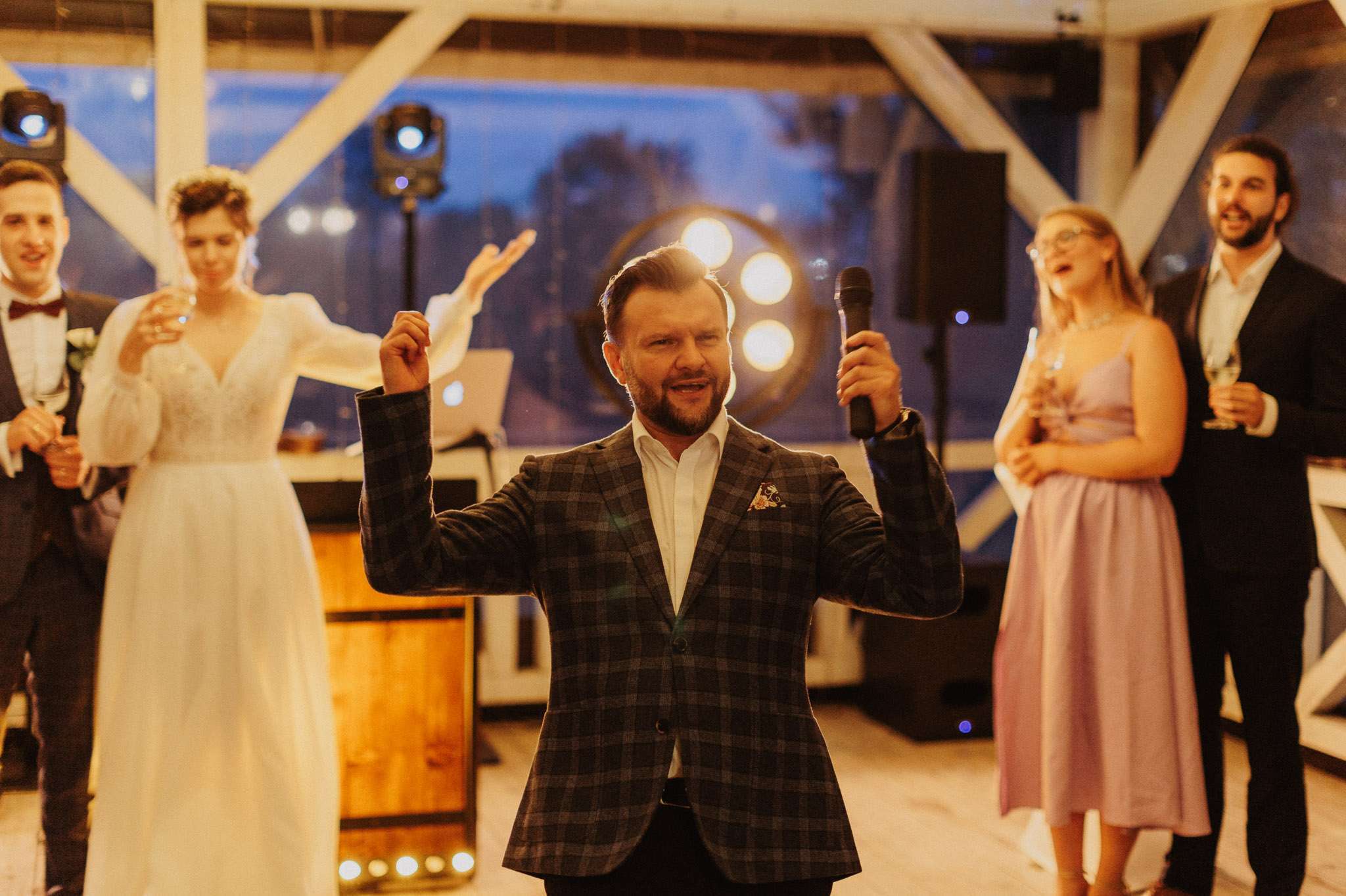 Dzięki temu praca z mikrofonem, prowadzenie wydarzeń i kontakt z publicznością są dla mnie całkowicie naturalne. Podczas imprez dbam o odpowiednie tempo wydarzenia, dobrą atmosferę oraz elegancki i swobodny styl prowadzenia, który pozwala gościom czuć się komfortowo i po prostu dobrze się bawić.